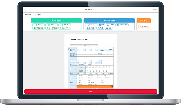 介護・医療現場における事故発生時の報告業務を支援する「事故報告書テンプレート作成画面」を制作。